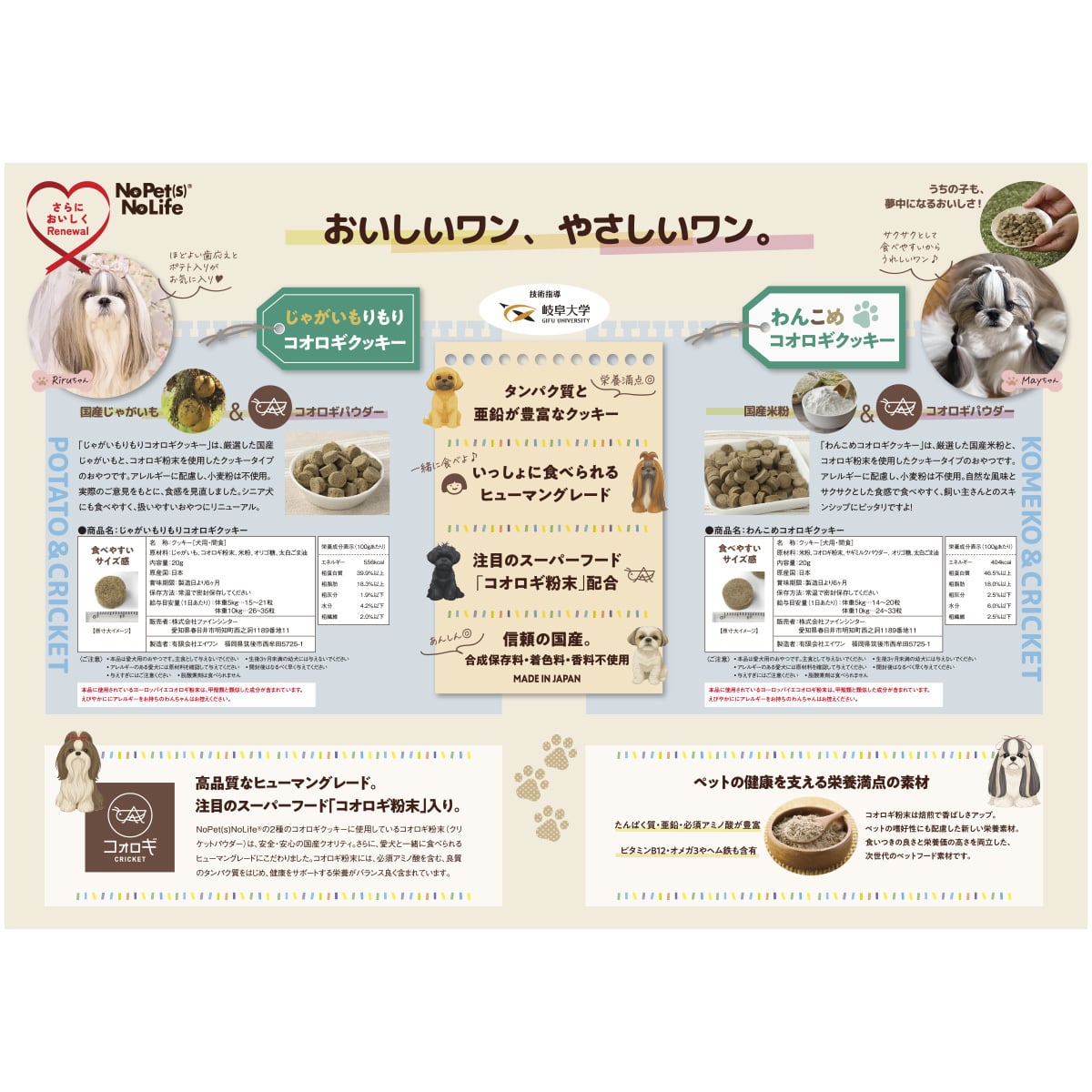 No Pet(S)No Life®の2種のコオロギクッキーに使用しているコオロギ粉末(クリケットパウダー)は、安全・安心の国産クオリティ。さらに、愛犬と一緒に食べられるヒューマングレードにこだわりました。コオロギ粉末には、必須アミノ酸を含む、良質のタンパク質をはじめ、健康をサポートする栄養がバランス良く含まれています。香ばしさのある風味とクセのない味でわんちゃんの嗜好性にもマッチ。